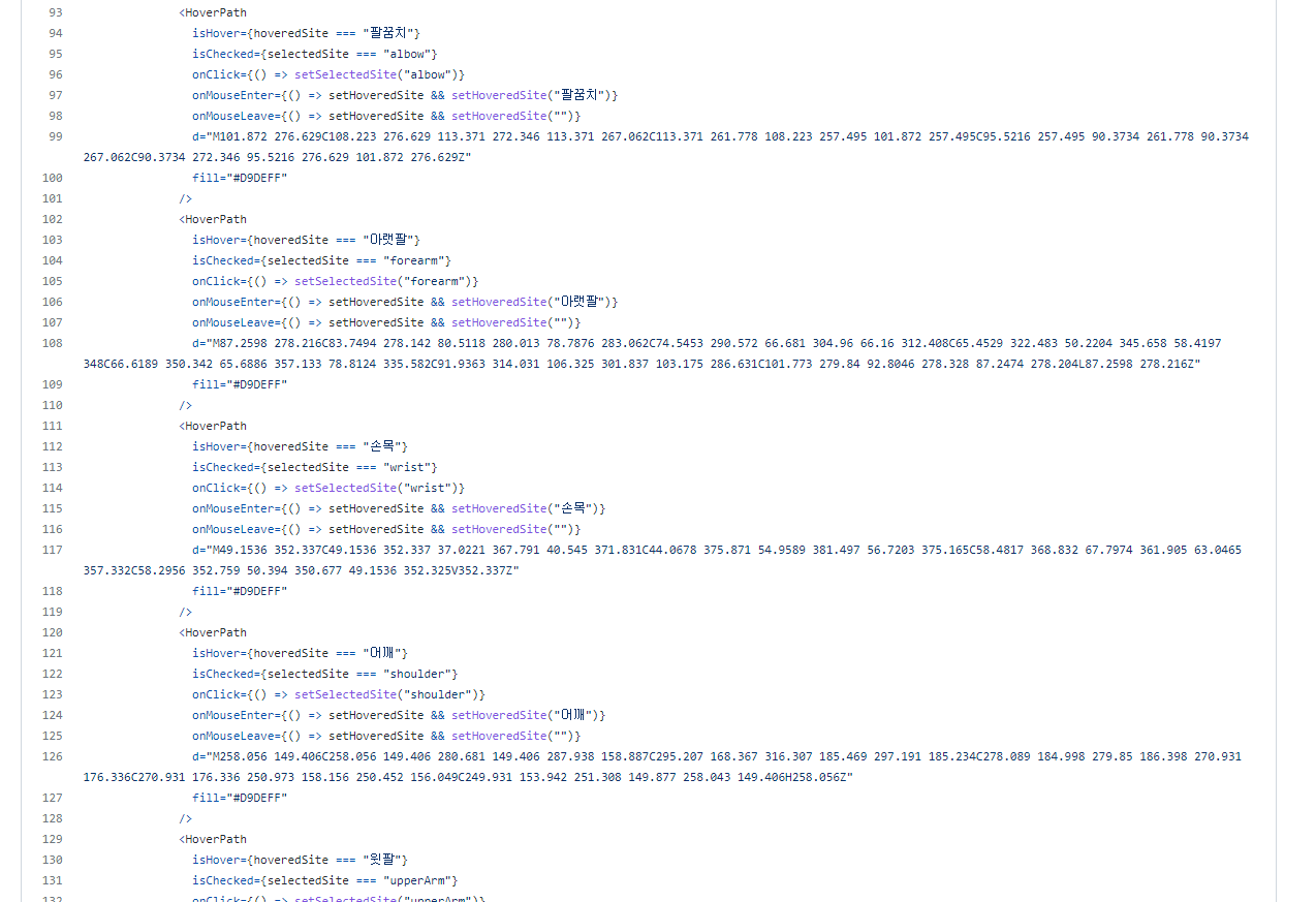 map()을 사용해서 HoverPath컴포넌트 반환 시 왼쪽, 오른쪽 구분이 있는 신체부위와 없는 부위를 if-else문으로 나눠서 작성한 점이다.