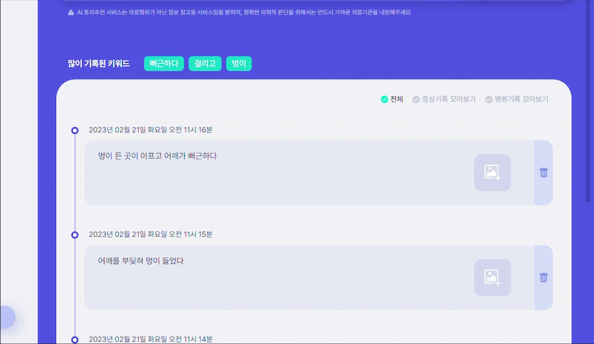 딥러닝 모델을 통해 사용자의 증상 기록에서 자주 등장하는 키워드 5개를 추출하여 “많이 기록된 키워드”로 보여주는 기능을 만들었다.