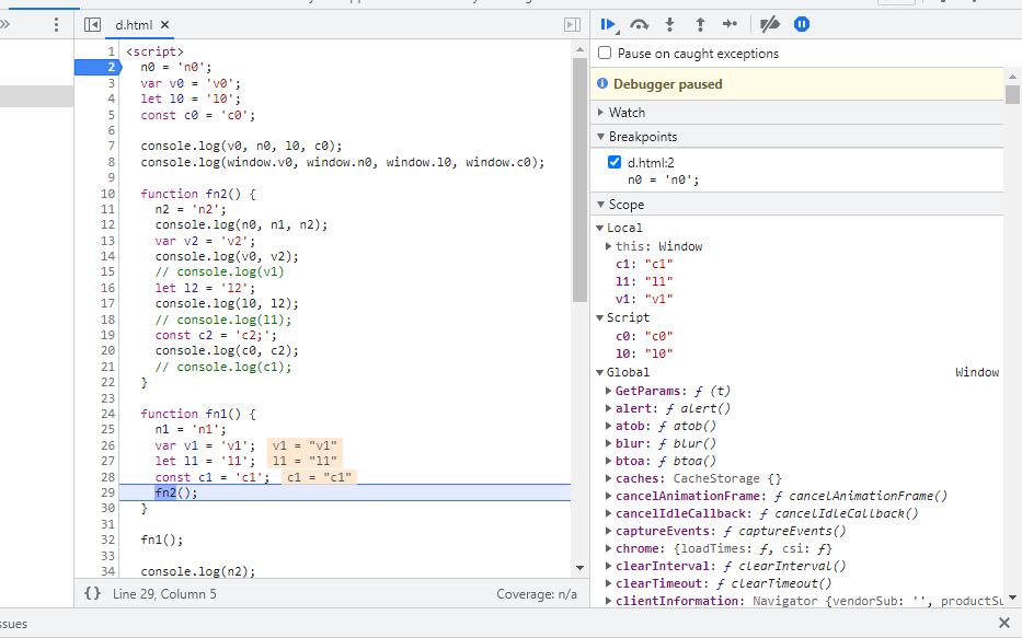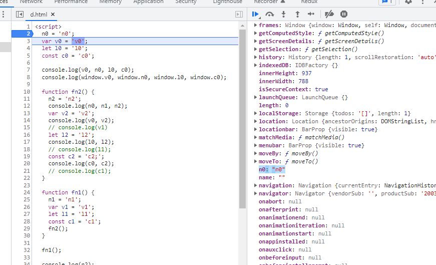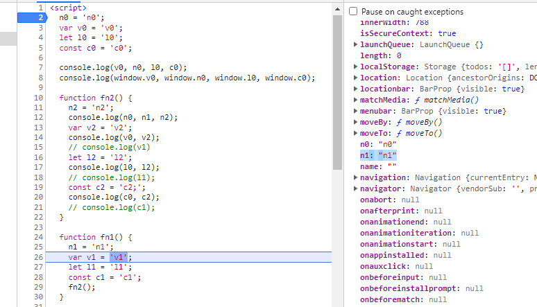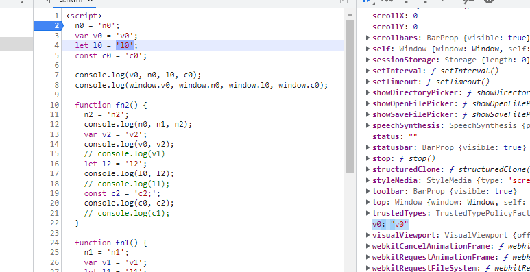 console.log(window.v0, window.n0, window.l0, window.c0) 의 경우, Global에 있는 변수만 찍히는 걸 볼 수 있다.