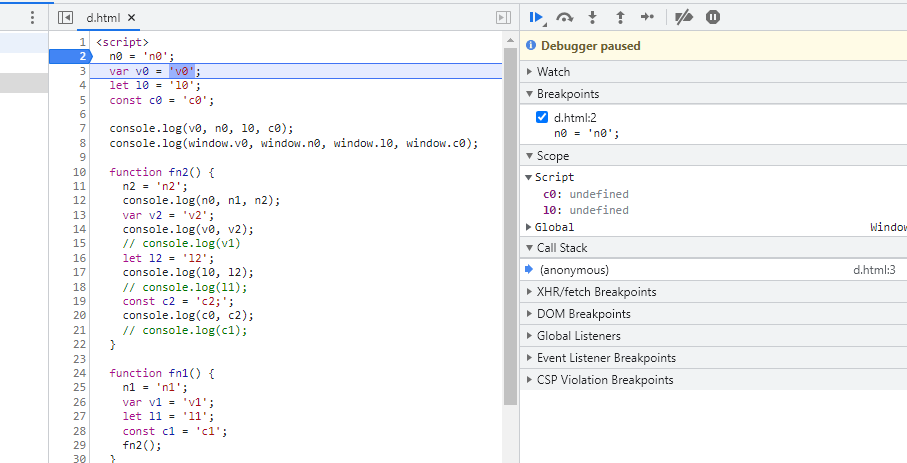 3번 라인(var v0='v0')을 실행하면 마찬가지로 Global에서 v0를 찾을 수 있다.