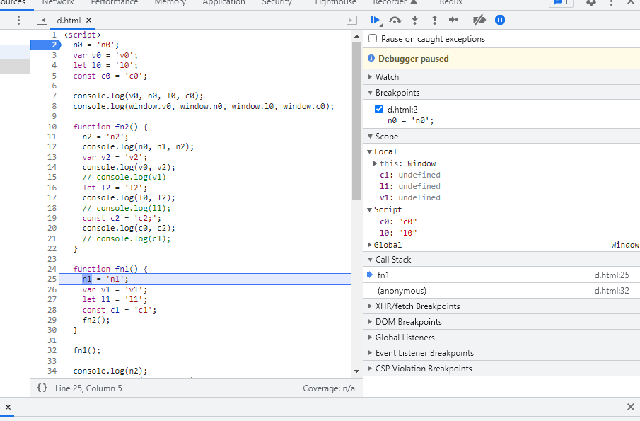 n0, n1, n2는 global scope에 있기 때문에 12번 라인에서 console을 실행하면 세 값 모두 잘 찍힌다.
