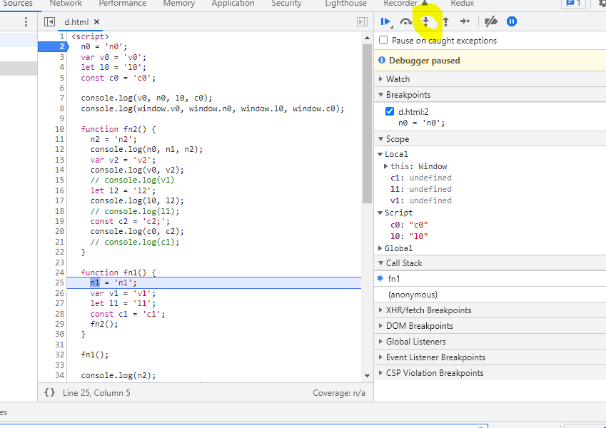 다음은 fn1()함수로 다이브하여 살펴보면, (아래 노란 표시된 버튼을 누르면 함수 안으로 들어갈 수 있다.)