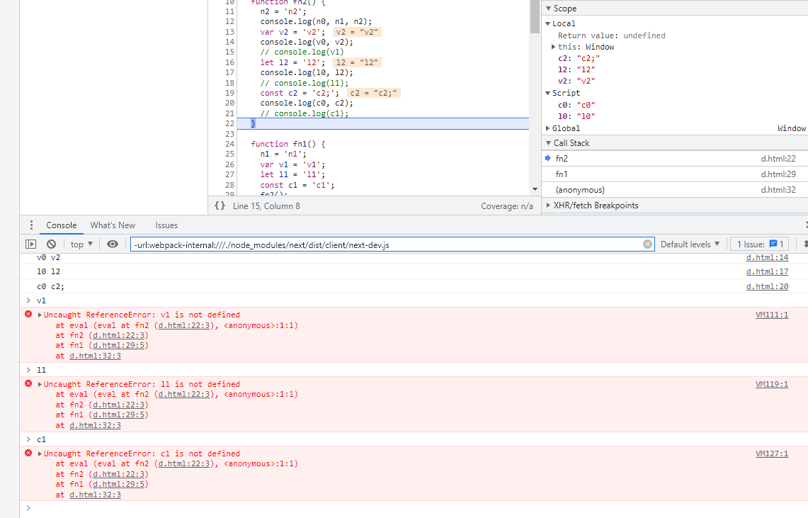 하지만 v1, l1, c1의 경우 fn2의 scope chain 내에 없는 변수이기 때문에 호출할 경우 에러가 발생한다.