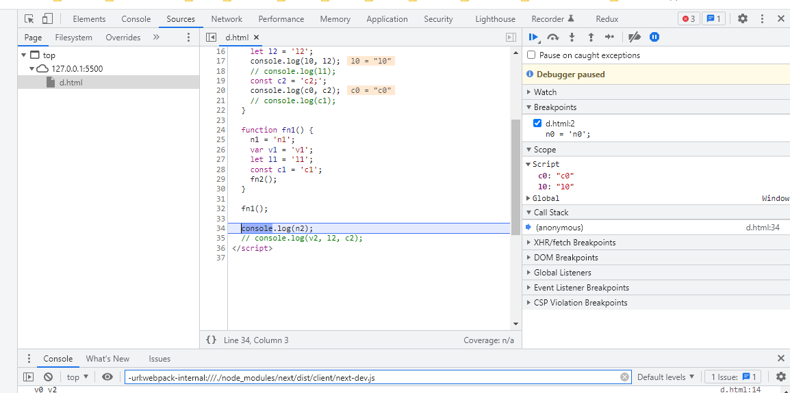 let l1, const c1을 실행하면 마찬가지로 local scope에 값이 들어오는 것을 확인할 수 있다.