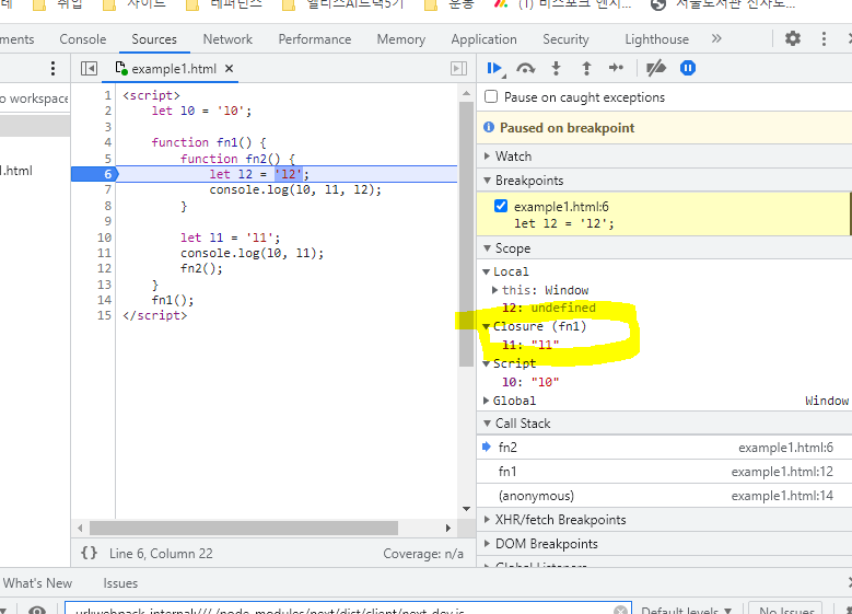 Scope 부분을 살펴보면 Closure(fn1) 이라는 것이 생겼고, Closure 안에 fn1 함수의 local이 저장되어 있는걸 확인할 수 있다.