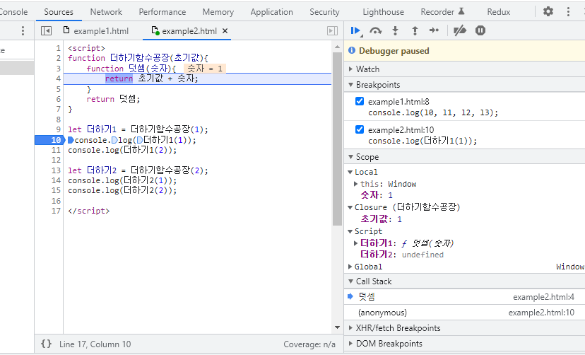 더하기1의 어휘적 환경에서 클로저 내부의 "초기값"은 1이지만 더하기2의 어휘적 환경에서 "초기값"은 2이다.