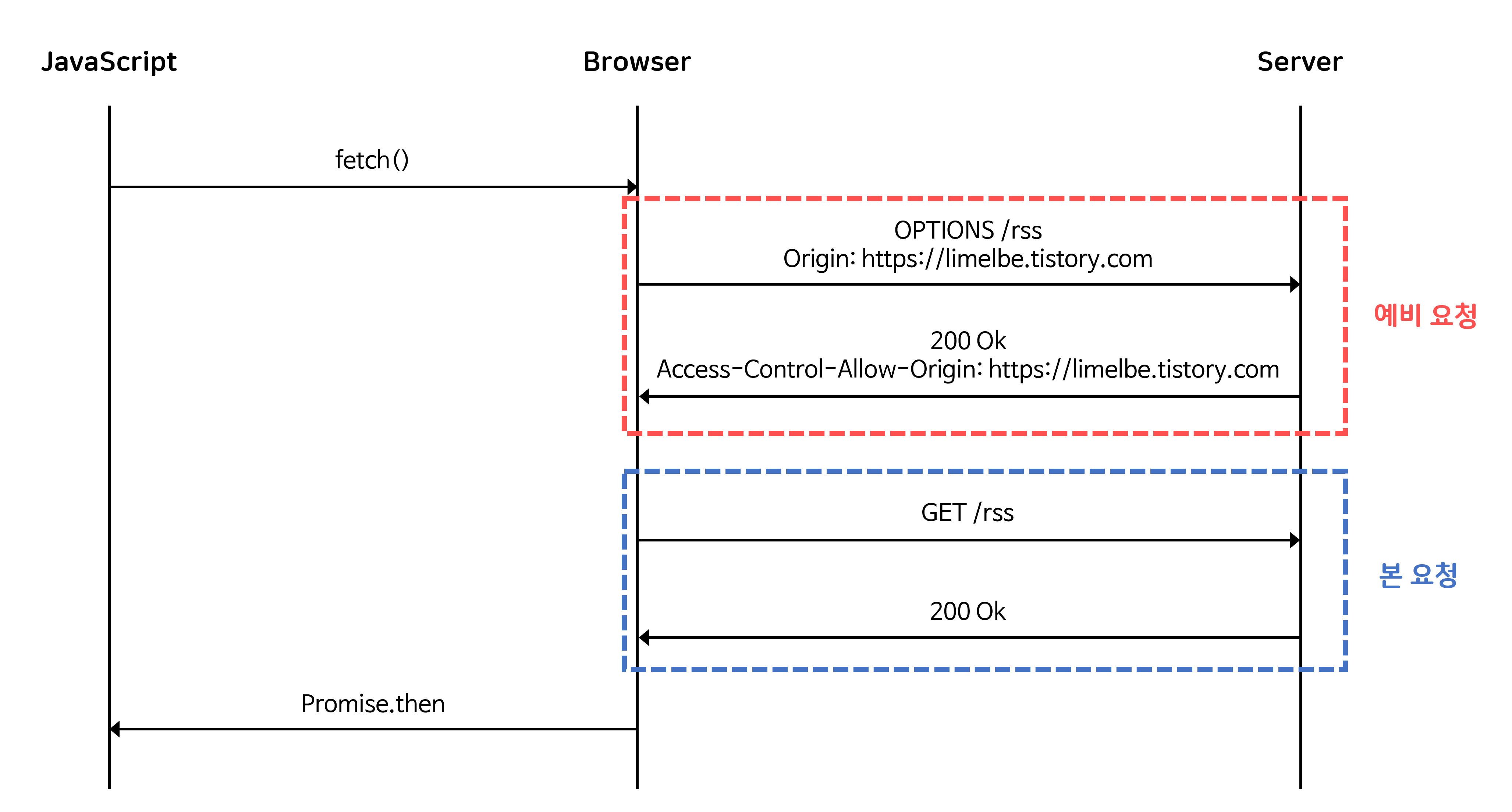 : 본격적인 교차 출처 HTTP 요청 전에 서버 측에서 그 요청의 메서드와 헤더에 대해 인식하고 있는지를 체크한다.