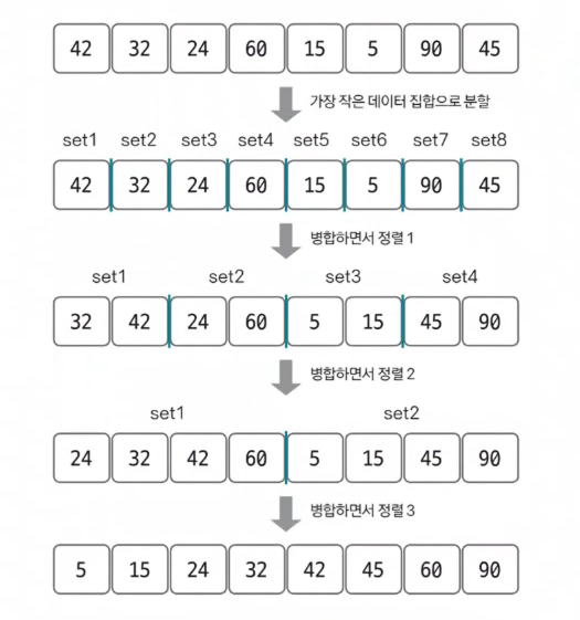 이미 정렬된 부분 집합들을 효율적으로 병합해 전체를 정렬하는 방식
