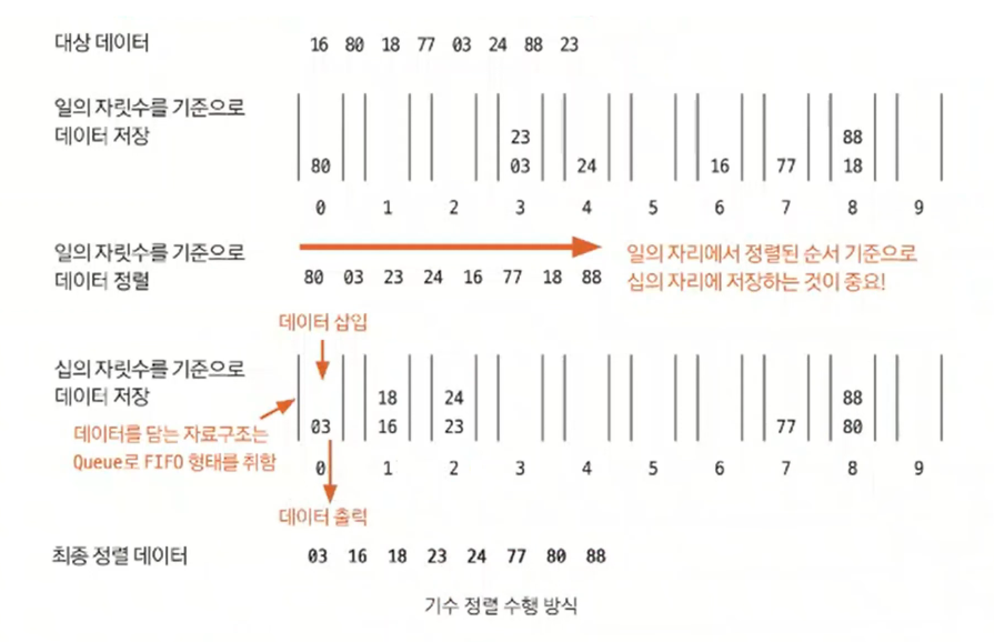 데이터의 자릿수를 바탕으로 비교해 데이터를 정렬하는 방식