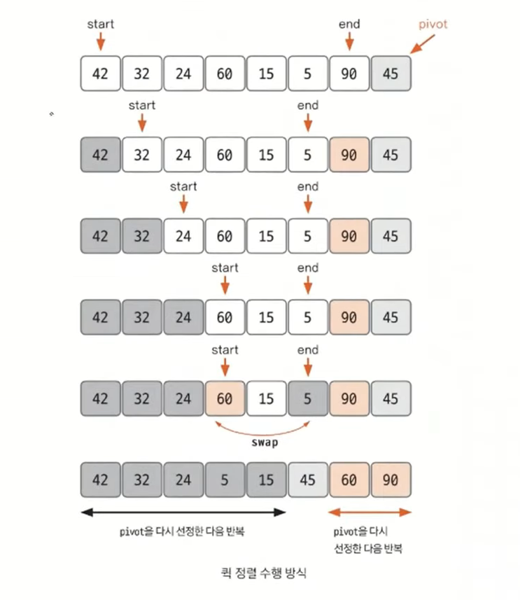pivot이 작으면 만난 지점의 왼쪽에 삽입 (삽입하거나 만난 지점의 데이터와 swap)