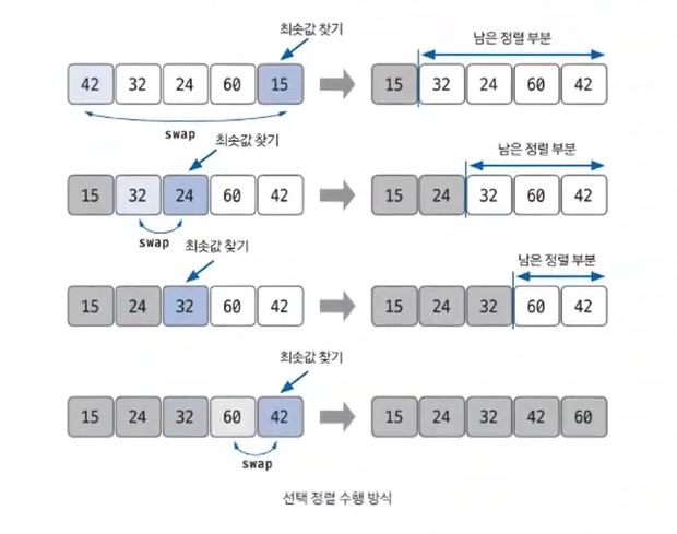 대상 데이터에서 가장 크거나 작은 데이터를 찾아가 선택을 반복하면서 정렬하는 방식
