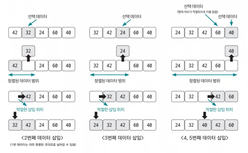 - 선택 데이터를 현재 정렬된 데이터 범위 내에서 적절한 위치에 삽입하는 것이 핵심