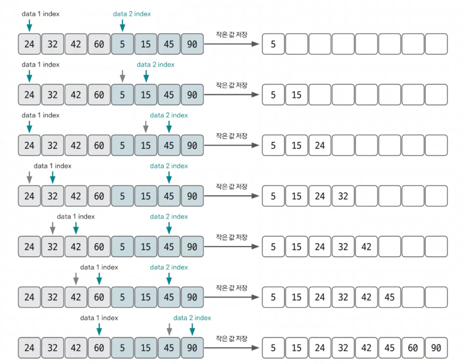 투 포인터 개념을 사용하여 2개의 그룹을 병합한다. 왼쪽 포인터와 오른쪽 포인터의 값을 비교하여 작은 값을 결과 배열에 추가하고 포인터를 오른쪽으로 1칸 이동시킨다.