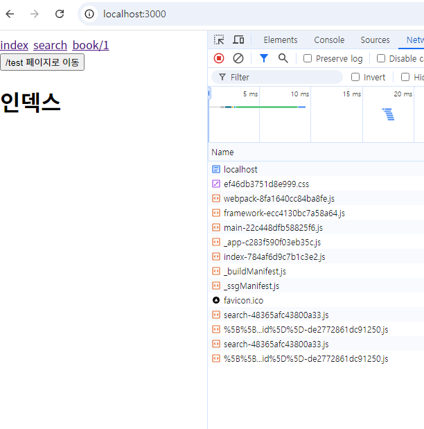 index페이지로 초기접속 시에도 search페이지와 book페이지에 필요한 js파일을 프리페칭해온 것을 확인할 수 있다.