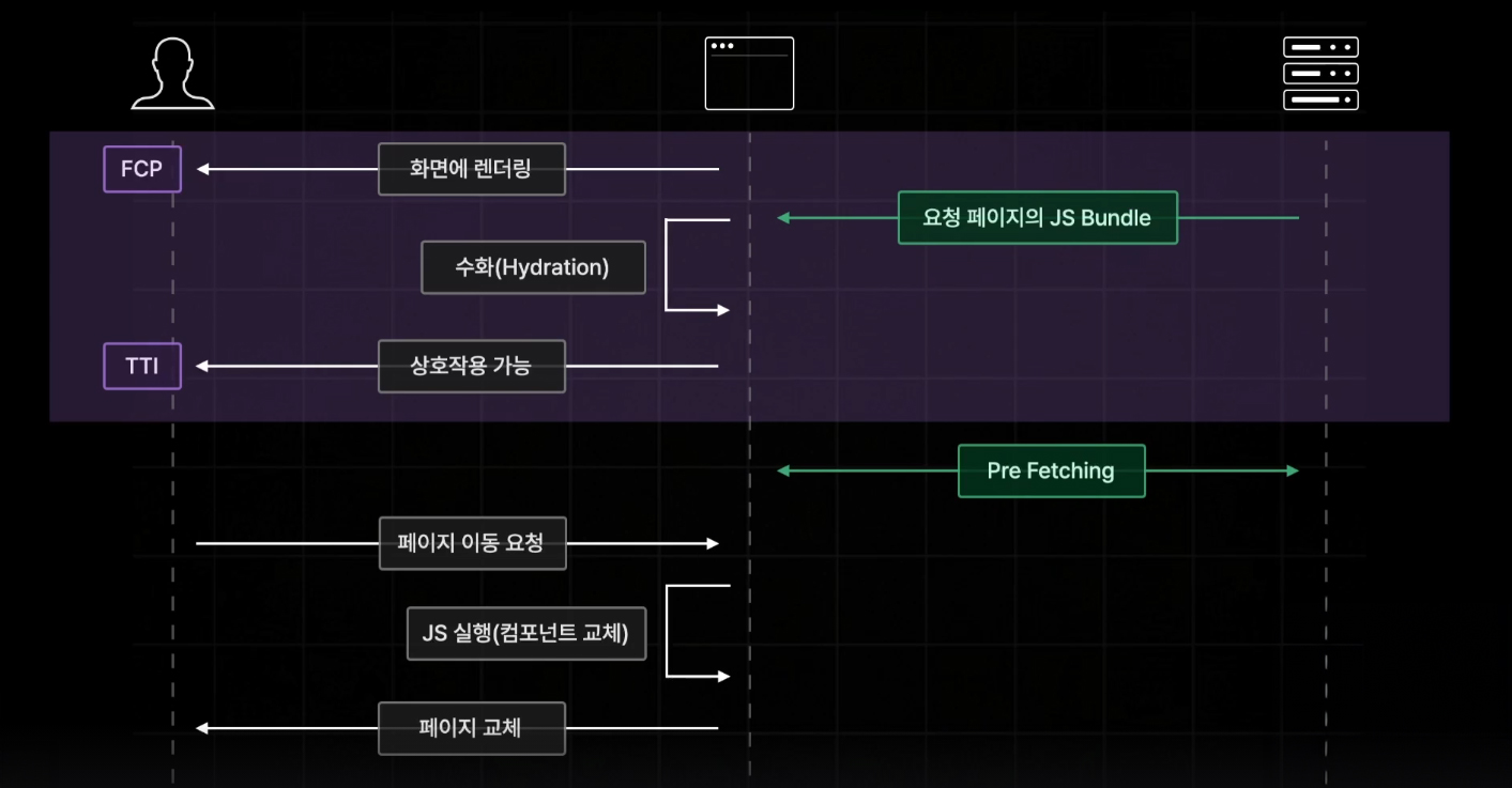 Next.js는 초기 접속 요청이 발생했을 때 사전렌더링이 되고 이후 서버가 모든 JS파일을 번들 형태로 브라우저에게 전달해준다.
