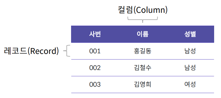 - 컬럼(Column)과 레코드(Record)로 구성된다. ( 컬럼 = 주제, 제목 / 레코드 = 내용, 값 )