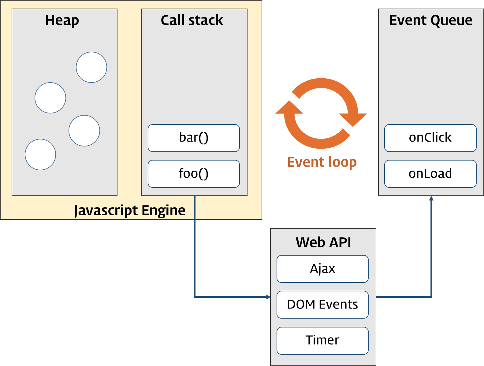 아래 그림과 같이 비동기 호출을 위해 사용하는 setTimeout이나 XMLHttpRequest와 같은 함수들은 자바스크립트 엔진이 아닌 Web API 영역에 따로 정의되어 있다. 또한 이벤트 루프와 태스크 큐와 같은 장치도 자바스크립트 엔진 외부에 구현되어있다.